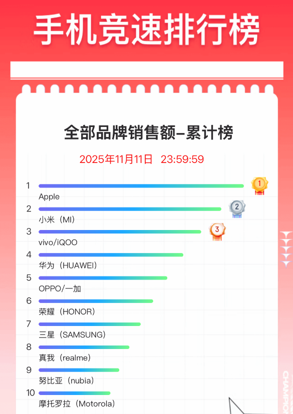 截至11月11日23:59:59,蘋果、小米、vivo位列銷量榜前三,這也算與大家原本的預(yù)期相符。