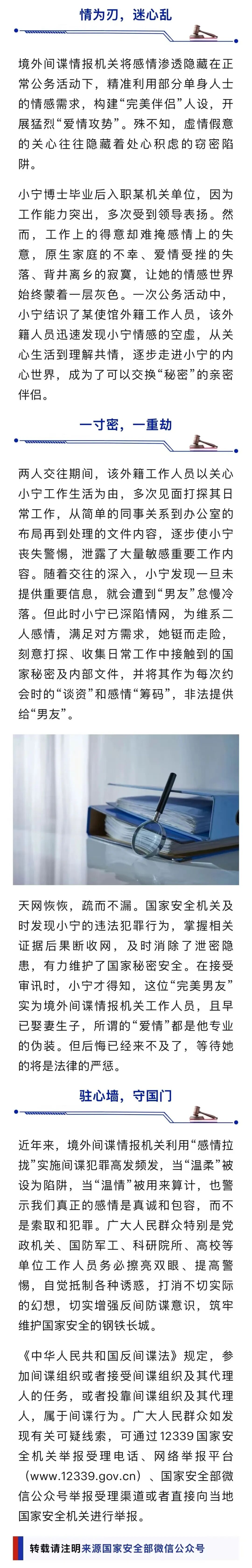 “他就是我的理想型,我以為愛情照進(jìn)了我的現(xiàn)實(shí),但沒有想到的是……”小寧坐在審訊椅上,手里攥著沾滿淚水的紙巾,泣不成聲地說到。近日,國家安全機(jī)關(guān)破獲一起某機(jī)關(guān)單位工作人員墜入境外間諜情報機(jī)關(guān)工作人員情感陷阱,利用職務(wù)之便為境外竊取、非法提供國家秘密的案件。