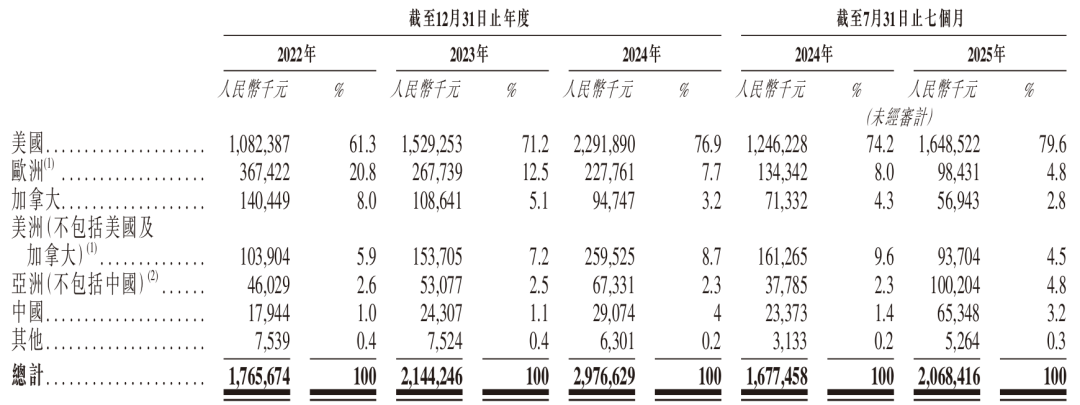 從收入結(jié)構(gòu)看,濤濤車業(yè)長(zhǎng)期高度依賴境外市場(chǎng),過(guò)去多年境外銷售收入占比始終維持在99%以上,顯著高于春風(fēng)動(dòng)力、隆鑫通用、力帆股份等同業(yè)公司。其中,美國(guó)是最大出口目的地,2022-2024年,來(lái)自美國(guó)的銷售收入占比從61.3%攀升至76.9%,2025年前七個(gè)月進(jìn)一步升至79.6%。