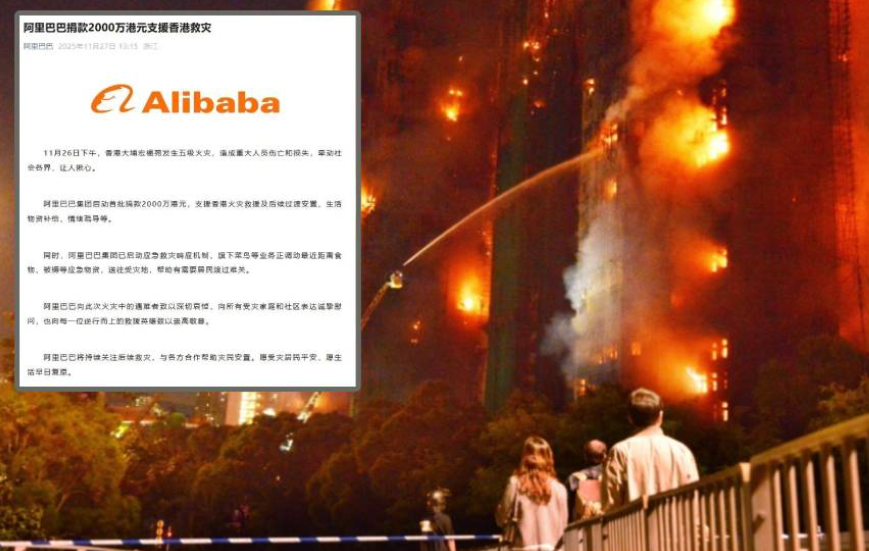 阿里巴巴也宣布已緊急啟動(dòng)首批捐款2000萬(wàn)港元,支援香港火災(zāi)救援及后續(xù)過渡安置、生活物資補(bǔ)給、情緒疏導(dǎo)等。同時(shí),也已啟動(dòng)應(yīng)急救災(zāi)響應(yīng)機(jī)制,菜鳥等業(yè)務(wù)正調(diào)動(dòng)最近距離食物、被褥等應(yīng)急物資,送往受災(zāi)地,幫助有需要居民渡過難關(guān)。