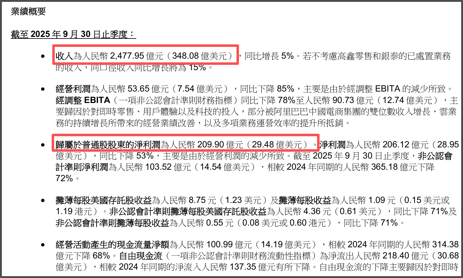 財(cái)報(bào)顯示,2025年7月至9月,阿里巴巴集團(tuán)實(shí)現(xiàn)收入2477.95億元,同比增長5%;由于對即時零售、用戶體驗(yàn)以及科技的投入,歸屬于普通股股東的凈利潤為209.9億元,同比下降53%。