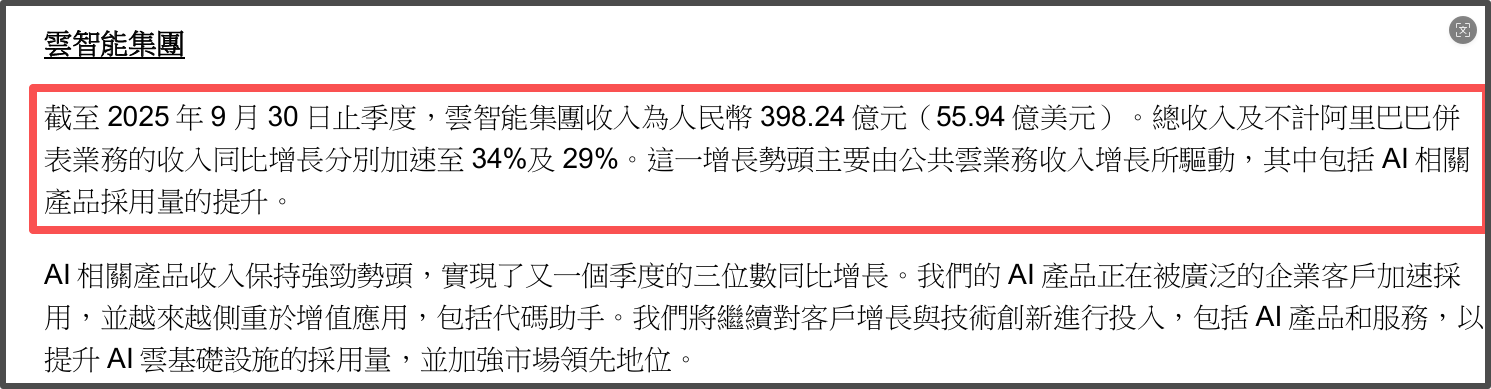 阿里巴巴集團(tuán)CEO吳泳銘在業(yè)績會上著重肯定了阿里云的業(yè)績:“旺盛的AI需求推動云智能集團(tuán)收入進(jìn)一步加速,季度收入同比增長34%,其中AI相關(guān)產(chǎn)品收入連續(xù)第九個季度實(shí)現(xiàn)三位數(shù)增長。”