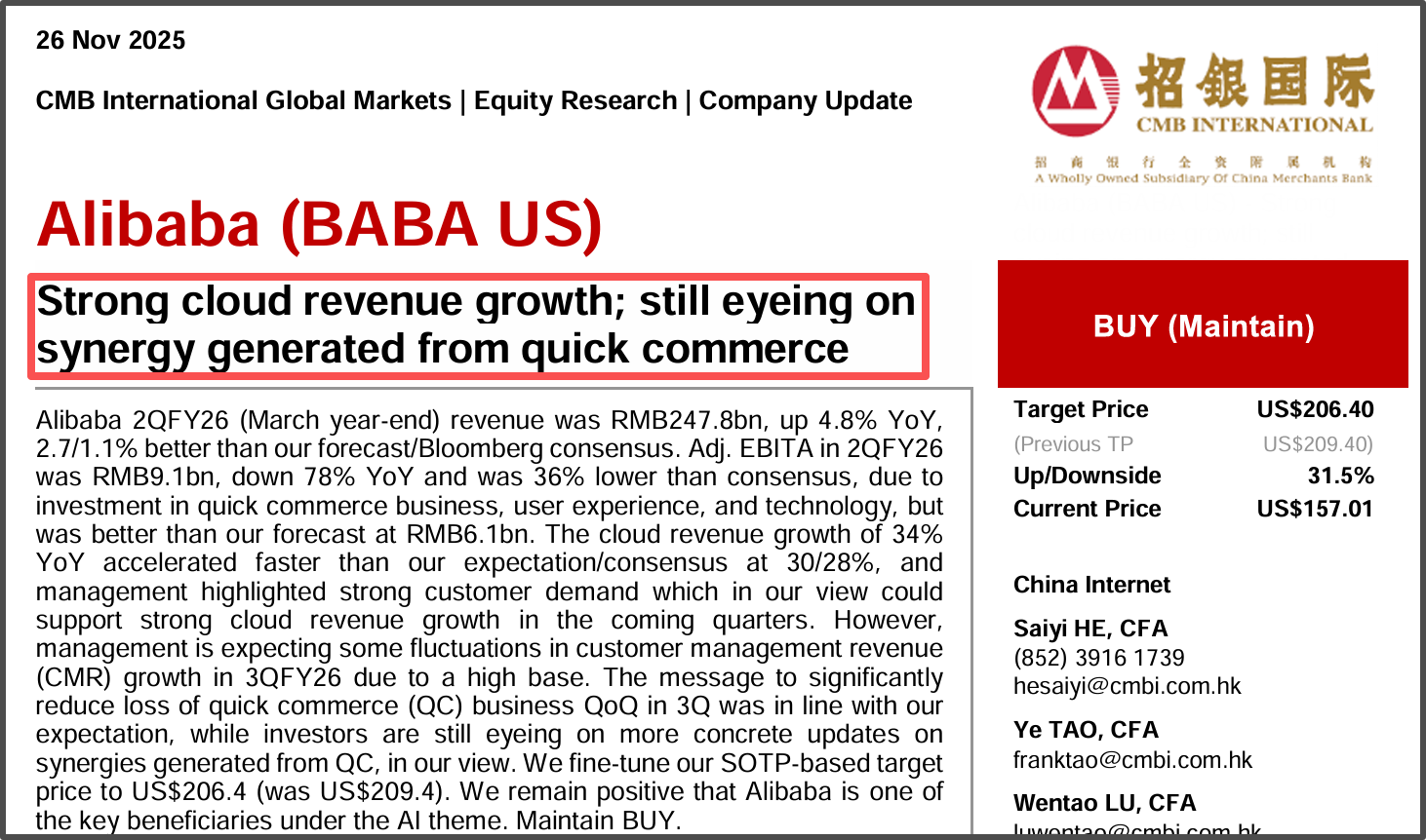 招銀國際預(yù)測,管理層強(qiáng)調(diào)強(qiáng)勁的客戶需求將支持未來幾個季度云收入的強(qiáng)勁增長。其積極認(rèn)為,阿里巴巴是人工智能主題下的主要受益者之一,維持買入評級。