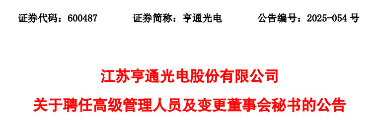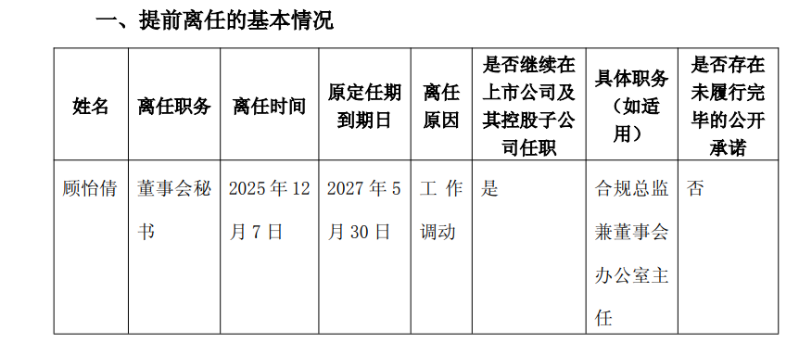 公告顯示,江蘇亨通光電股份有限公司董事會收到董事會秘書顧怡倩因工作調(diào)動的書面辭職報告,其于2025年12月7日不再擔(dān)任公司董事會秘書職務(wù),原定任期到2027年5月30日,后續(xù)將擔(dān)任公司合規(guī)總監(jiān)兼董事會辦公室主任,且不存在未履行完畢的公開承諾,其崗位變動對公司正常經(jīng)營無不利影響。