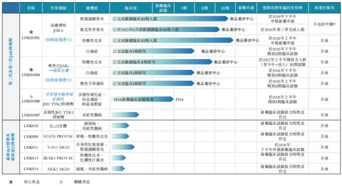 此外,可穿透血腦屏障的TYK2抑制劑LNK01006已于2025年11月獲FDA臨床批件,擬拓展至神經(jīng)退行性疾病領(lǐng)域,顯示了公司向神經(jīng)系統(tǒng)疾病延伸的布局意圖。