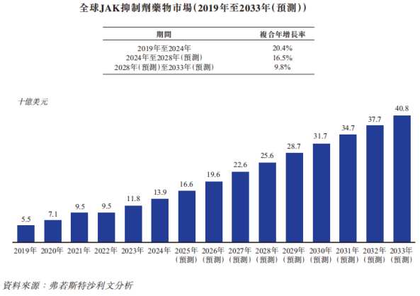 從市場規(guī)模來看,JAK抑制劑賽道展現(xiàn)出強(qiáng)勁的增長動(dòng)能。據(jù)弗若斯特沙利文數(shù)據(jù)顯示,全球JAK抑制劑市場規(guī)模已從2019年的55億美元迅速擴(kuò)張至2024年的139億美元,預(yù)計(jì)到2028年將達(dá)到256億美元,2033年有望突破408億美元。中國市場的增長尤為顯著,從2019年的4億元人民幣躍升至2024年的38億元,預(yù)計(jì)2028年將達(dá)171億元,2033年進(jìn)一步攀升至465億元,顯示出巨大的臨床需求與商業(yè)前景。