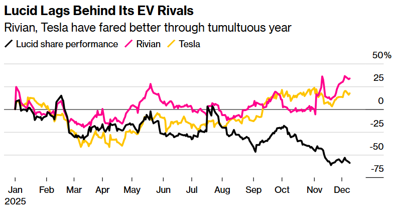 上圖顯示,Lucid落后于其電動汽車領(lǐng)域的那些最強勁競爭對手們,尤其是Rivian、特斯拉在需求動蕩的一年中表現(xiàn)更好。