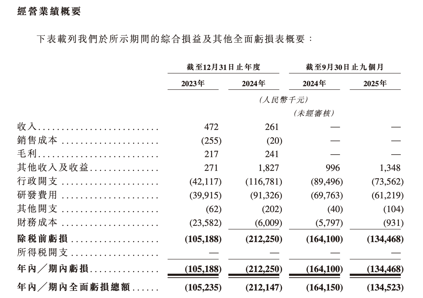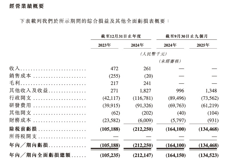 據(jù)招股書,2023年-2024年及2025年前9個月,華芢生物實現(xiàn)收入分別為47.2萬元、26.1萬元、0;年內(nèi)/期內(nèi)虧損分別為1.05億元、2.12億元、1.34億元??梢姡浣衲昵叭径葻o營收無盈利。