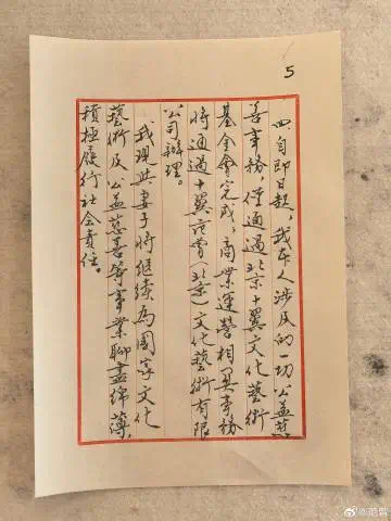 四、自即日起,我本人涉及的一切公益慈善事務(wù),僅通過(guò)北京十翼文化藝術(shù)基金會(huì)完成;商業(yè)運(yùn)營(yíng)相關(guān)事務(wù),將通過(guò)十翼范曾(北京)文化藝術(shù)有限公司辦理。
