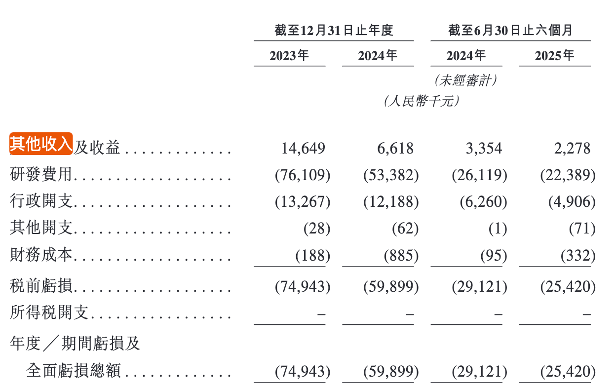 公司也在招股書中承認,迄今為止尚未從產(chǎn)品銷售中獲得任何收入,每期都出現(xiàn)凈虧損的狀態(tài)。2023年-2025年上半年,公司凈虧損分別約為7494.3萬元、5989.9萬元、2542萬元,兩年半時間累計虧損1.6億元,且公司預計于短期內(nèi)還將繼續(xù)錄得大額經(jīng)營虧損。