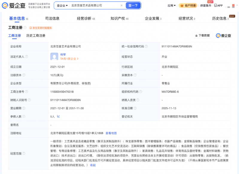 愛企查App顯示,十翼范曾(北京)文化藝術有限公司成立于今年12月2日,法定代表人為徐萌,注冊資本100萬元人民幣,經(jīng)營范圍包括文藝創(chuàng)作、金銀制品銷售、珠寶首飾零售等。股東信息顯示,該公司由徐萌和范曾分別持股51%、49%,徐萌為該公司實際控制人。