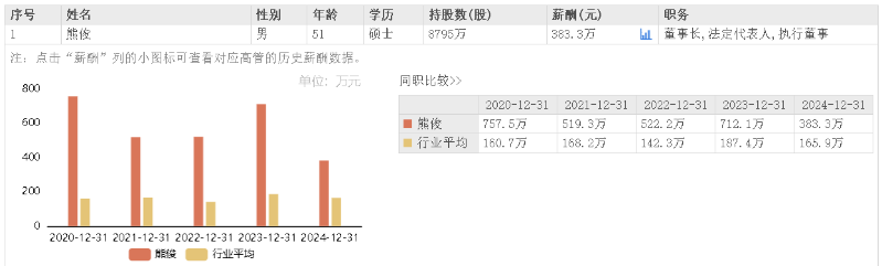 據(jù)東方財(cái)富網(wǎng)數(shù)據(jù),熊俊2024年所獲薪酬為383.3萬元,相較上年薪酬712.1萬元降薪46.17%。