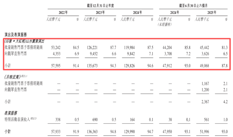 財(cái)務(wù)數(shù)據(jù)背后,其“一劇獨(dú)大”的業(yè)務(wù)結(jié)構(gòu)暗含經(jīng)營(yíng)風(fēng)險(xiǎn)。過去三年,來自《印象·大紅袍》的門票收入占公司總收入九成以上,2025年上半年雖降至87.8%,但仍處于絕對(duì)主導(dǎo)地位。同時(shí),這一業(yè)務(wù)的毛利率總體維持在55%-64%左右(2022年受疫情影響降至38%),顯著高于其他業(yè)務(wù),進(jìn)一步凸顯核心IP的不可替代性。