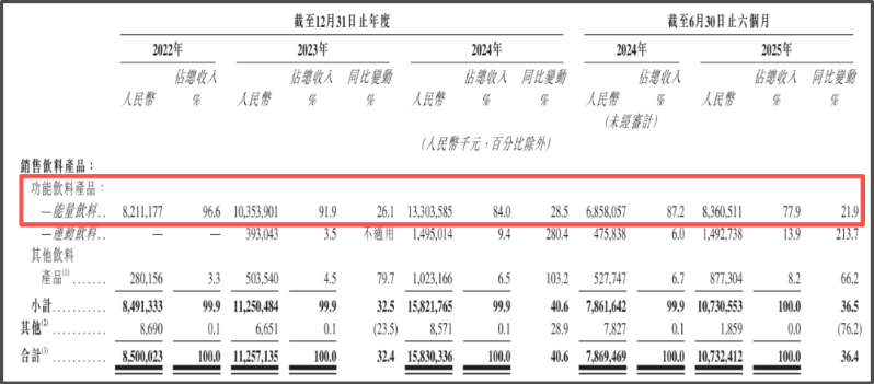 首先,東鵬飲料產(chǎn)品結(jié)構(gòu)單一的風險依然未得到緩解,2025年前三季度,盡管新品“東鵬補水啦”電解質(zhì)飲料營收占比已提升至16.91%,但以東鵬特飲為核心的能量飲料仍貢獻接近75%營收。