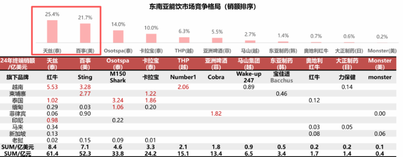 但當?shù)氐母偁幐窬忠矘O為嚴峻。華安證券認為,東南亞區(qū)域天絲、百事處于第一梯隊,市場份額均在20%以上;Osotspa、卡拉寶為第二梯隊,份額介乎10%至15%。尤其是在核心的越南市場,天絲紅牛產(chǎn)品份額達到42%,百事Sting產(chǎn)品份額為25%,THP的產(chǎn)品Number1則占16%,頭部品牌已形成穩(wěn)固渠道與品牌壁壘。