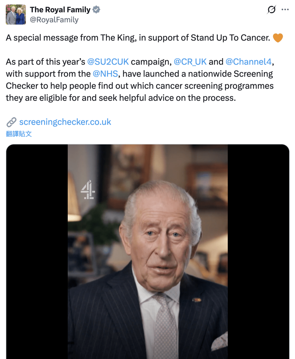 ▲查理斯透露,多虧早期診斷和有效治療,他本人的癌癥治療時(shí)間表在新一年可以減少,并藉此機(jī)會(huì)強(qiáng)烈呼吁國(guó)民及早接受篩選檢查。
