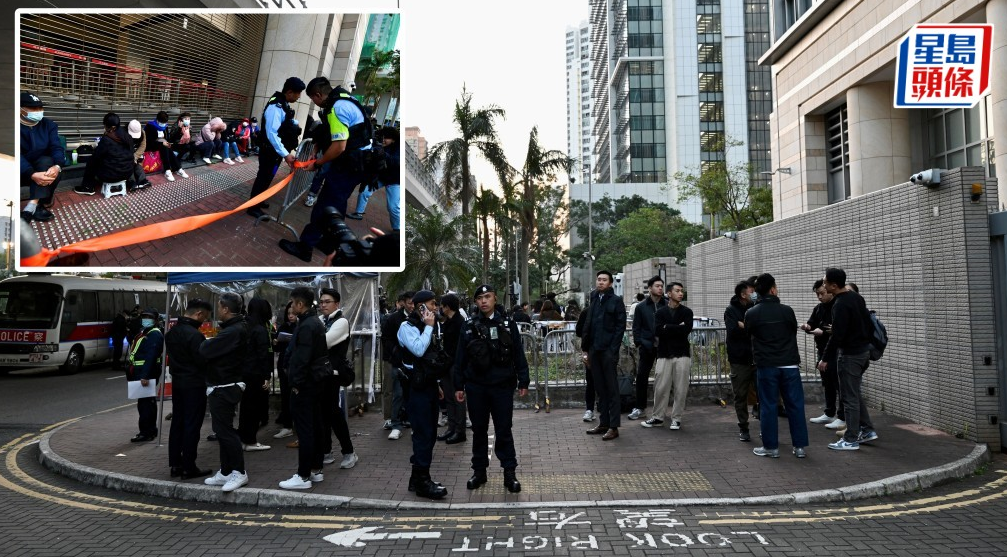 自今早約7時起,西九龍法院外已有逾80人排隊等候入庭旁聽,警方在附近一帶加強戒備,多輛警車及“劍齒虎”裝甲車在現(xiàn)場待命,亦有警員帶同警犬巡邏。大量警員于法院外、及至東京街一帶候命,并對排隊入庭人士及途人進(jìn)行截查。