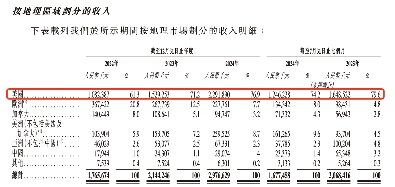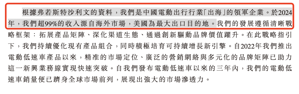 值得一提的是,根據(jù)弗若斯特沙利文的資料,濤濤車業(yè)是中國電動出行行業(yè)“出海”的領(lǐng)軍企業(yè)。于2024年,公司超99%的收入源自海外市場,美國為最大出口目的地。其中,2024年76.9%收入來自美國,到了2025年前7個月,該比例上升至79.6%。