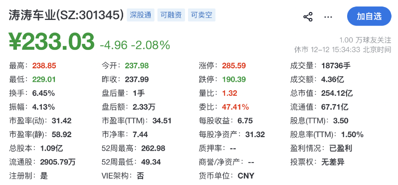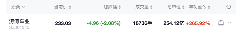 截至發(fā)稿時,濤濤車業(yè)A股報233.03元,總市值約254.12億元。自年初至今,其股價累計上漲265.92%。